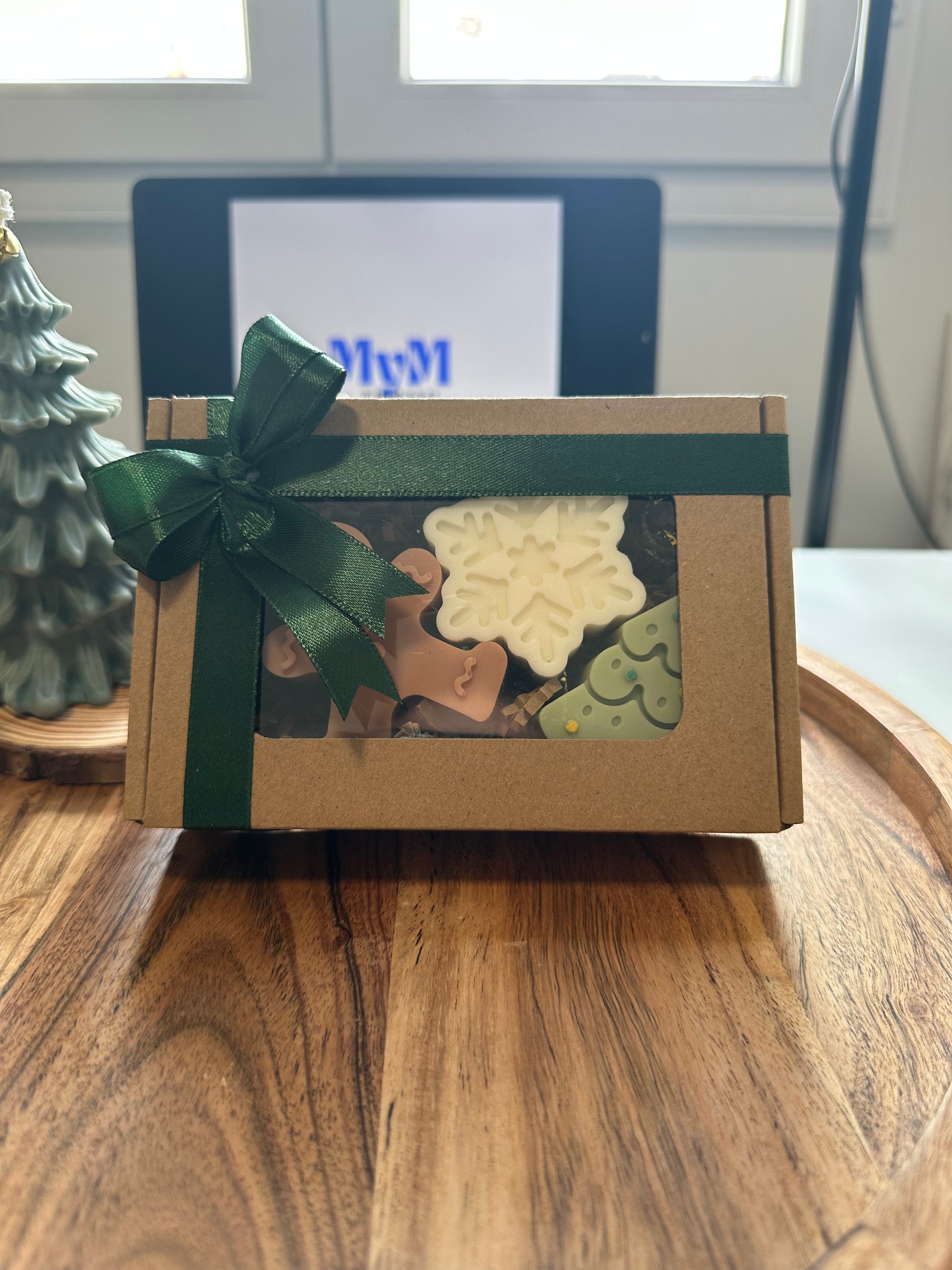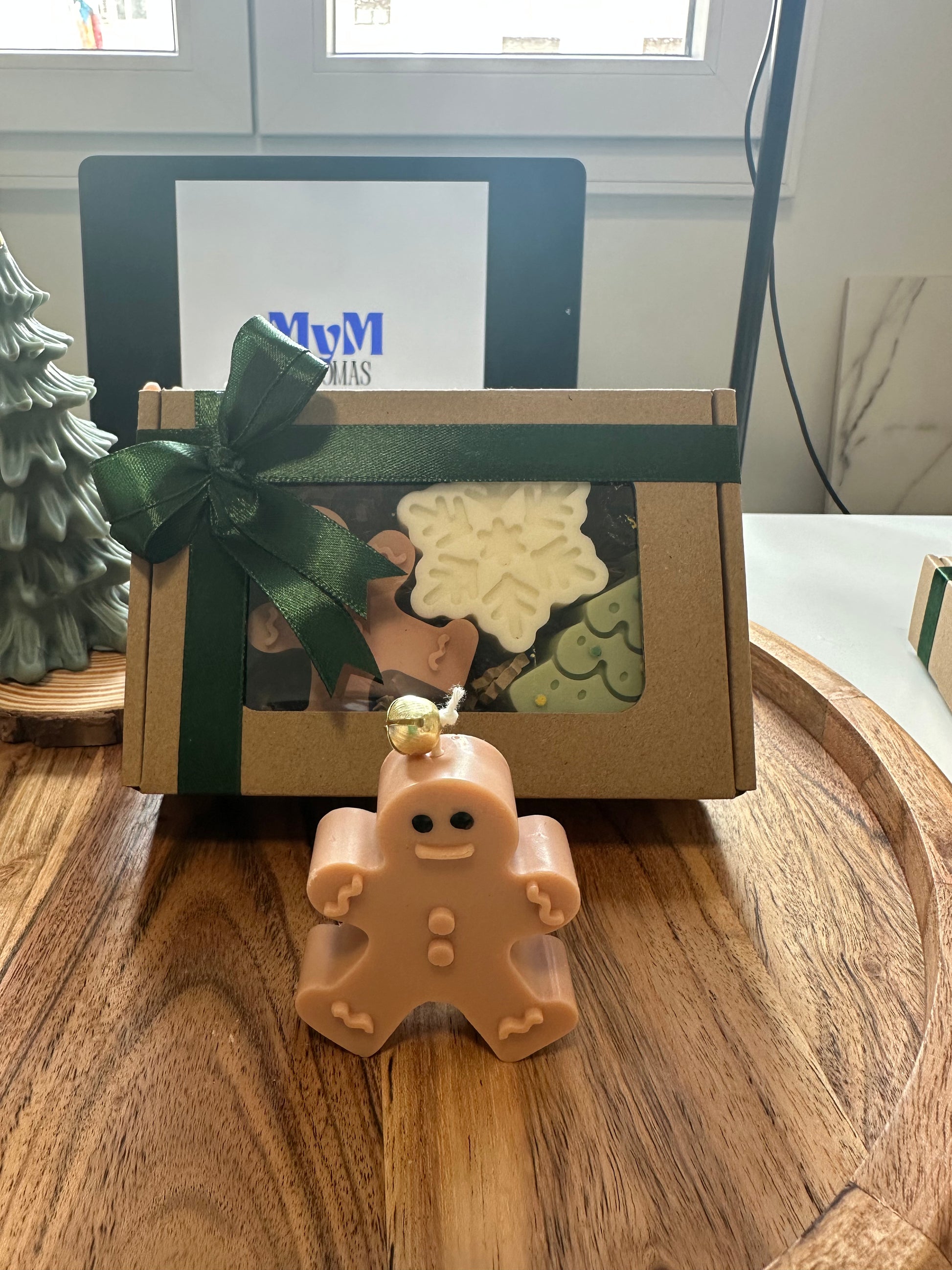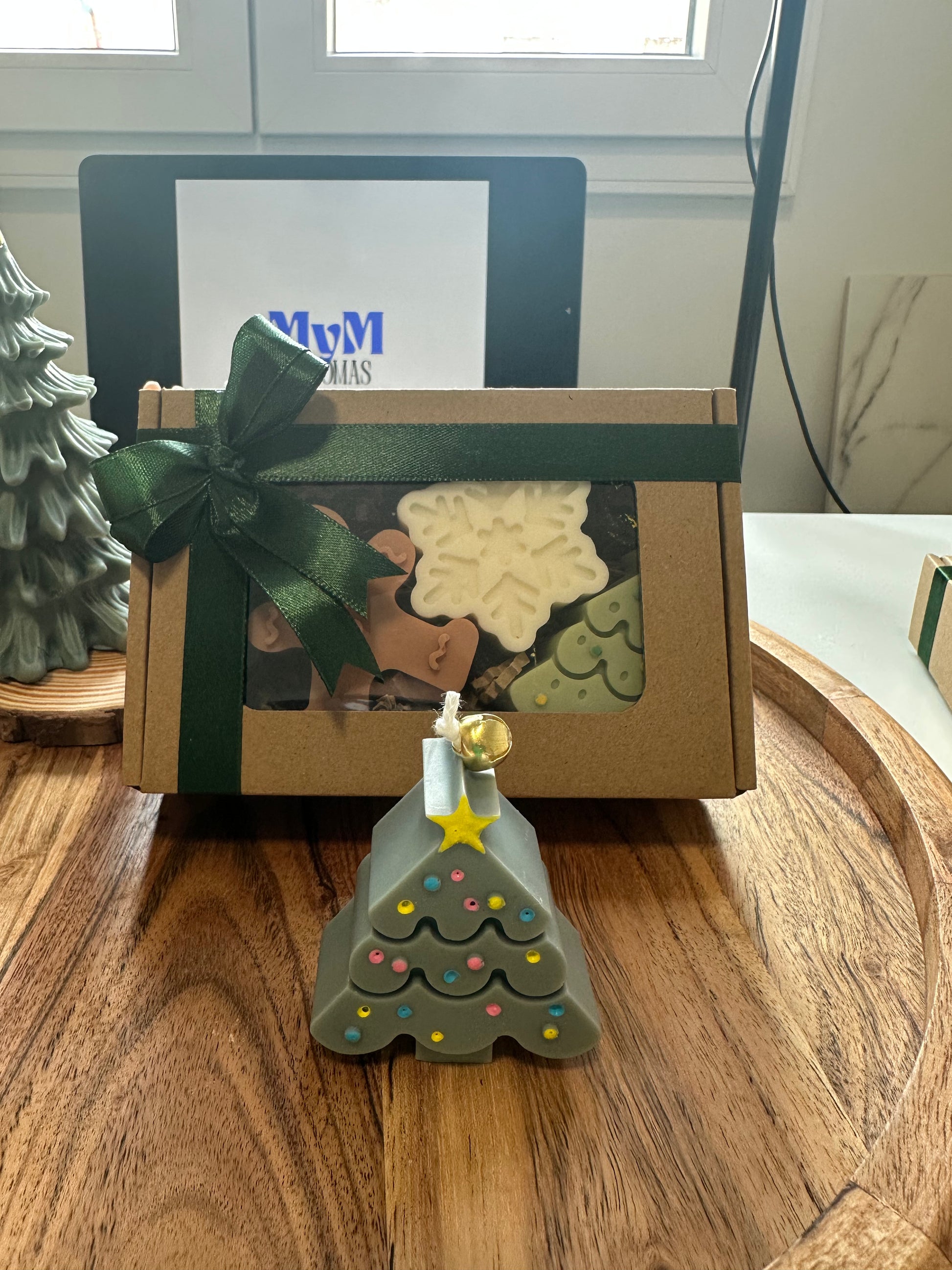 Caja decorativa con 3 figuras árbol, copito, muñeco de jengibre.Con 3 aromas diferentes árbol tiene aroma abeto, olor fresco con notas cítricas, copito de nieve tiene aroma a hoguera de otoño, olor a madera mojada recién apagada, muñeco de jengibre tiene aroma a galletas de jengibre, olor dulce y especiado.