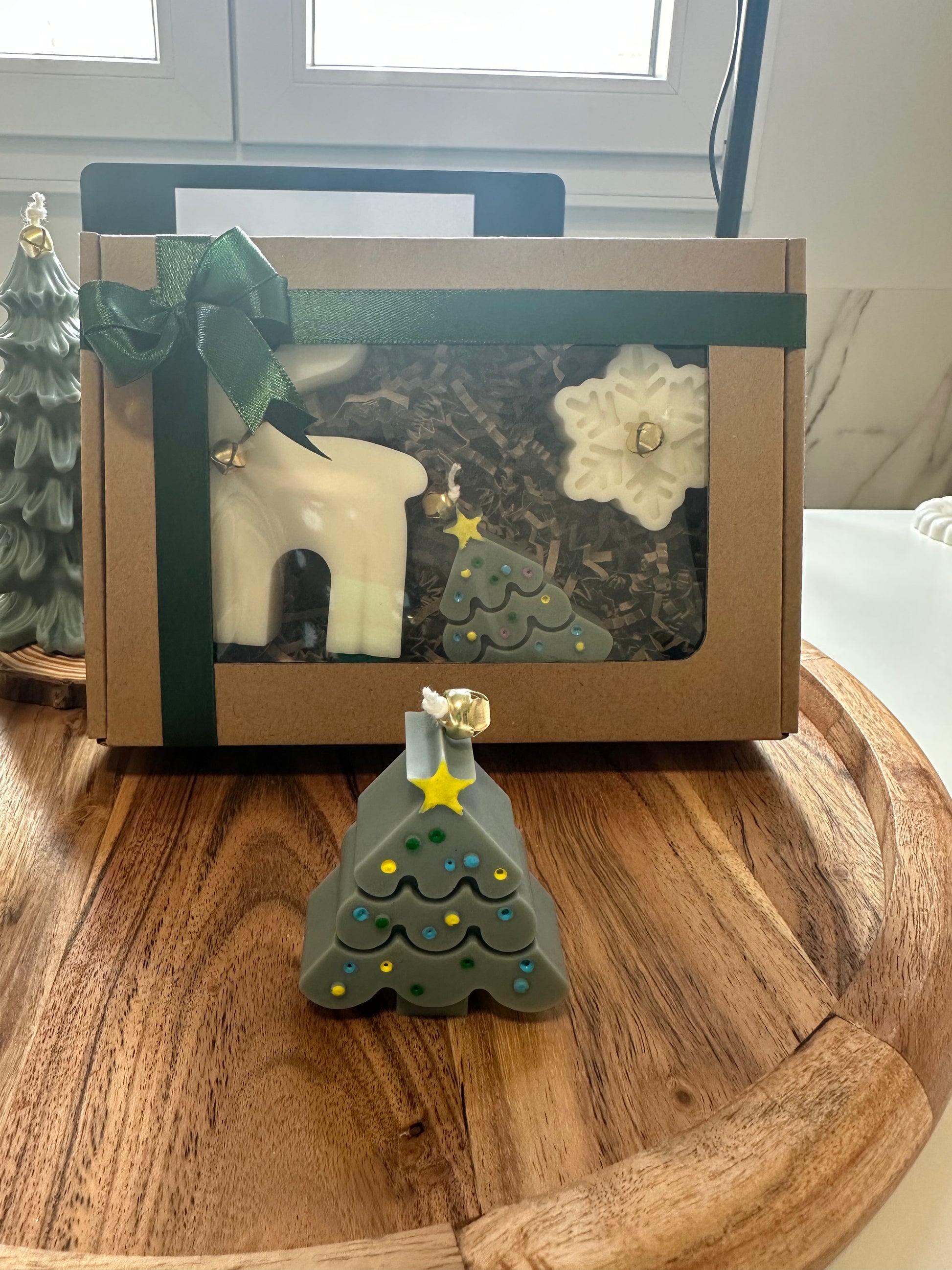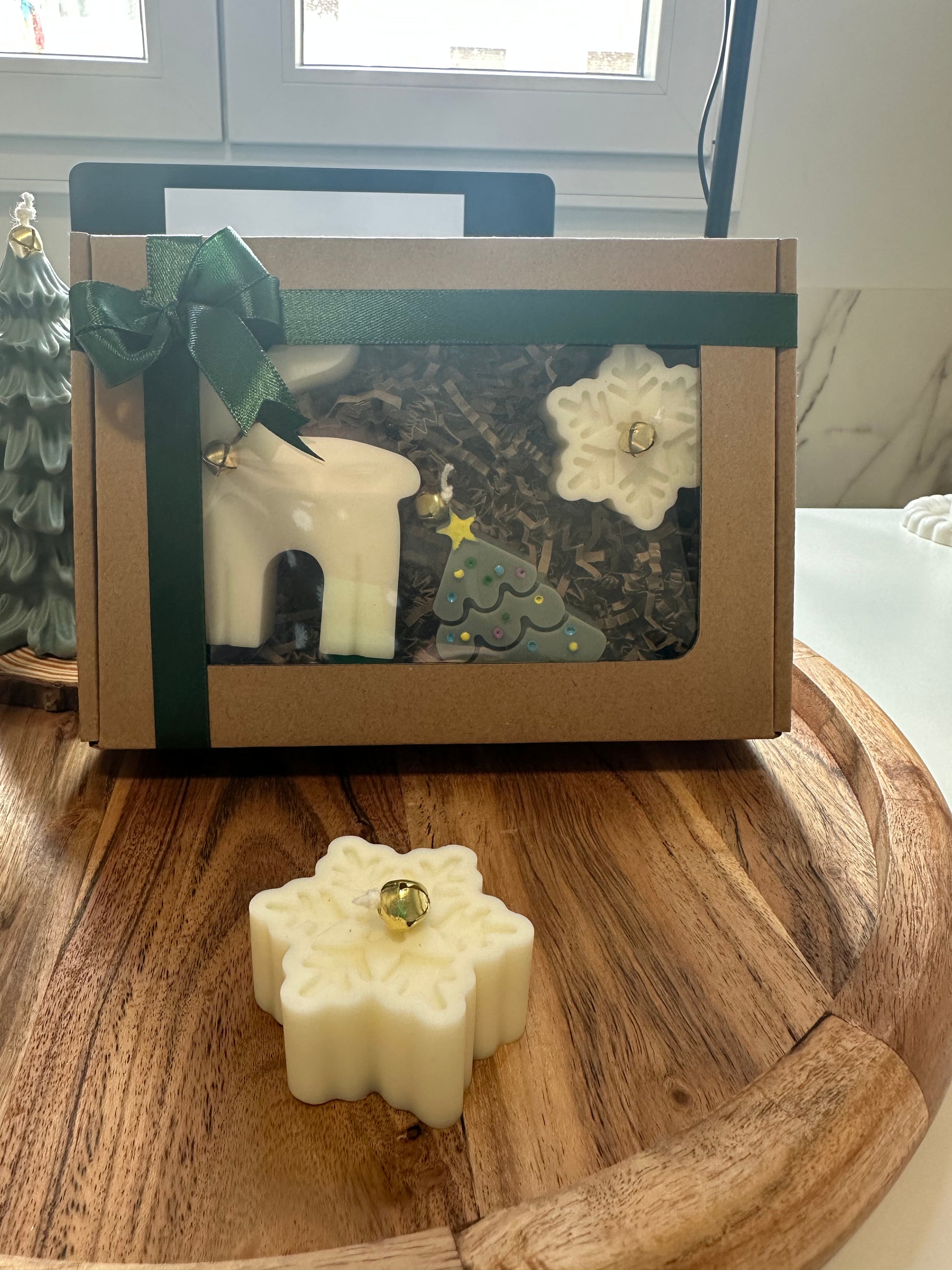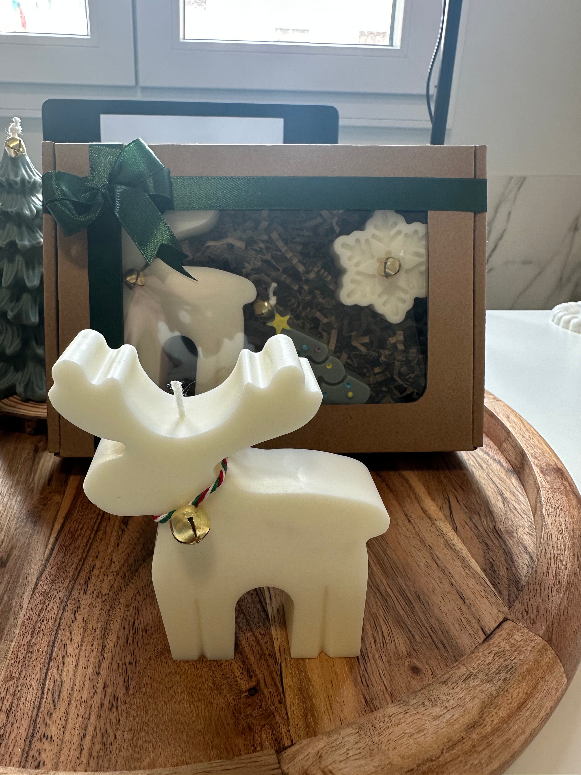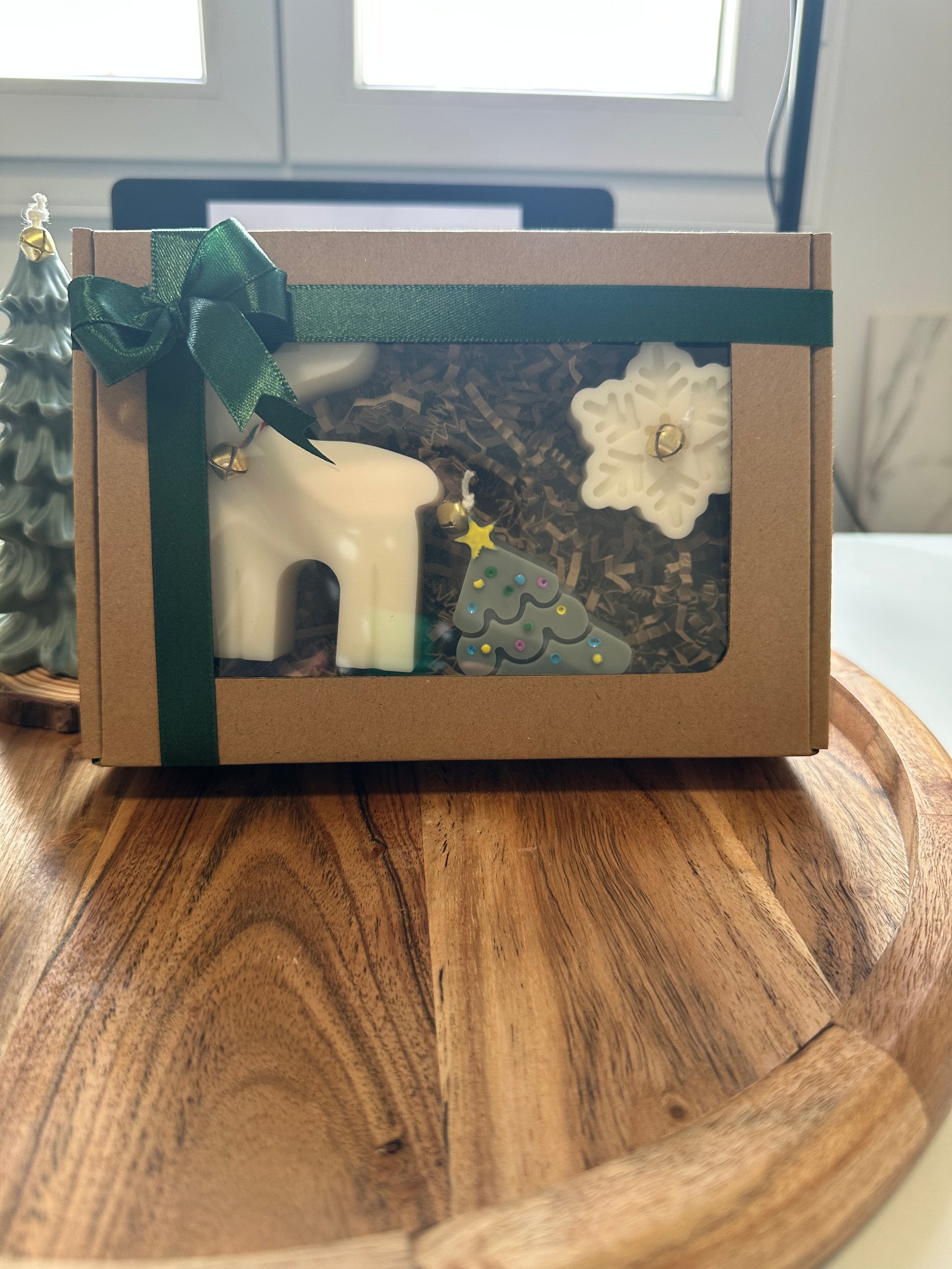 Caja decorativa con 3 figuras reno, copito de nieve, árbol de navidad, ideal para regalar o para decorar tu casa. Tiene 2 aromas diferentes el reno y copito de nieve el aroma es hoguera de otoño, huele a madera mojada después de apagarla, el árbol tiene aroma a abeto olor fresco con notas citrícas