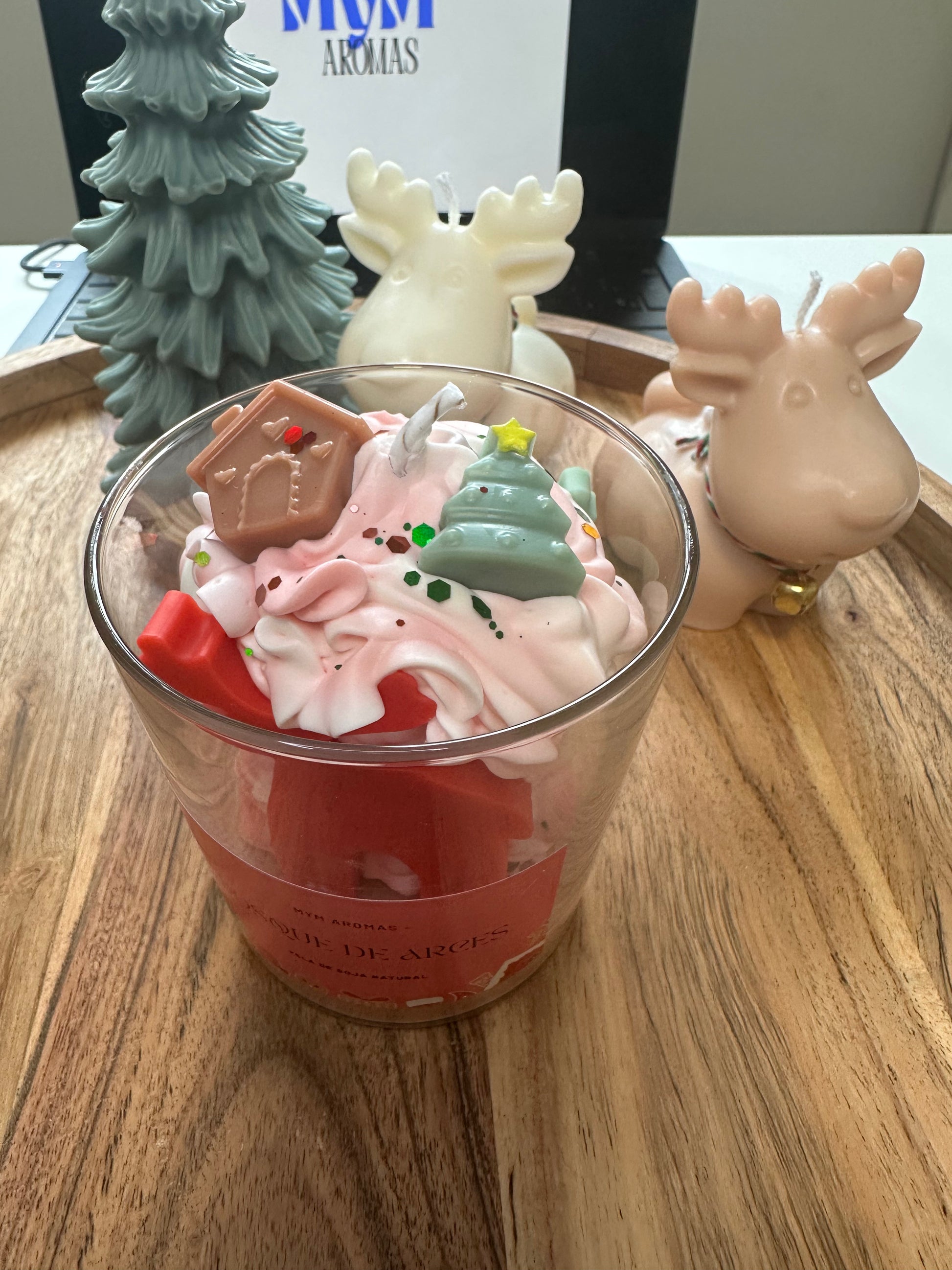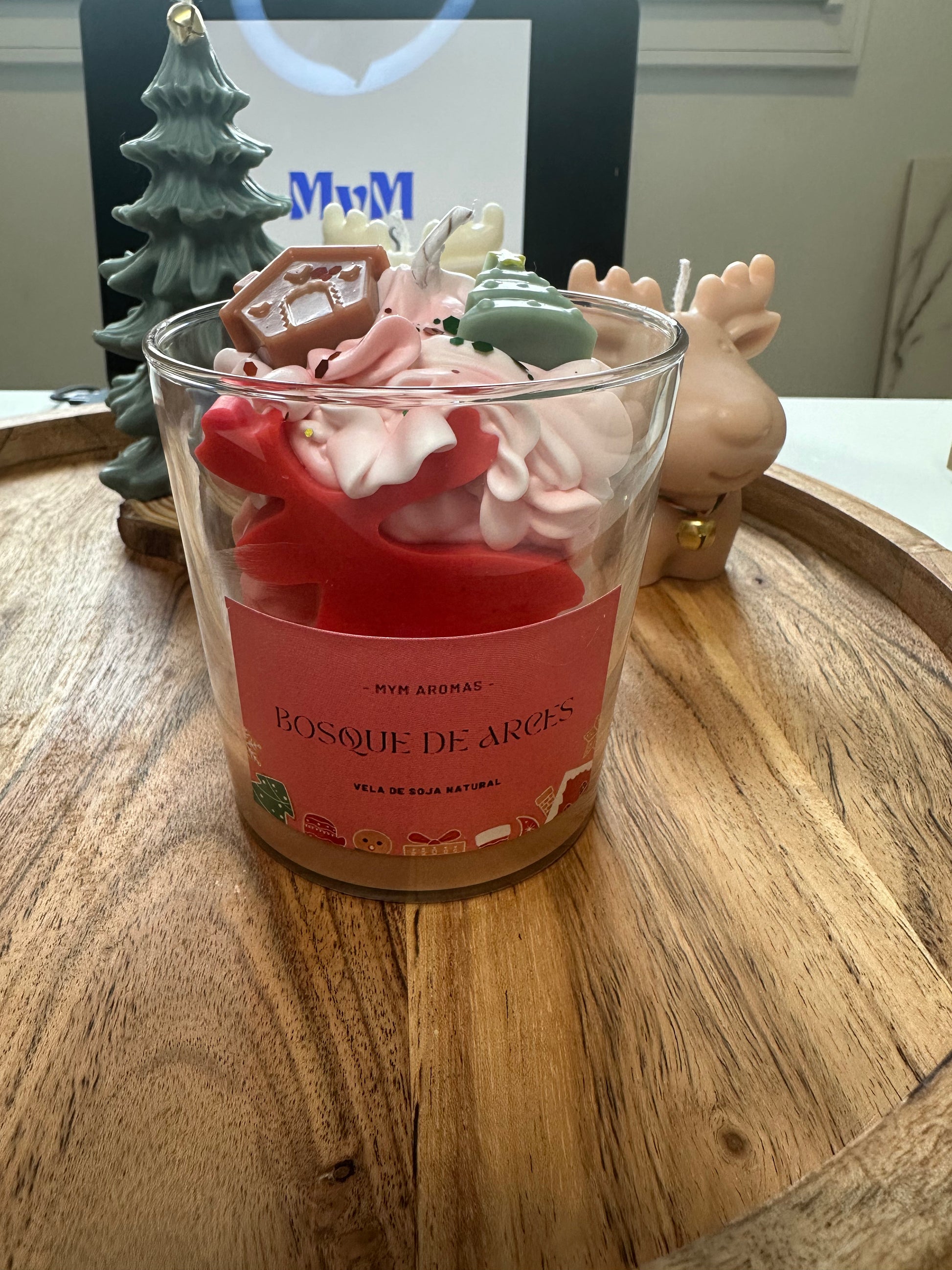 vela bosque de arces, con formas de arces recubierto en chantilly con dos formas arriba de casita y árbol de navidad, su aroma a madera spiced te envolverá con sus toques a madera, vainilla, musgo...