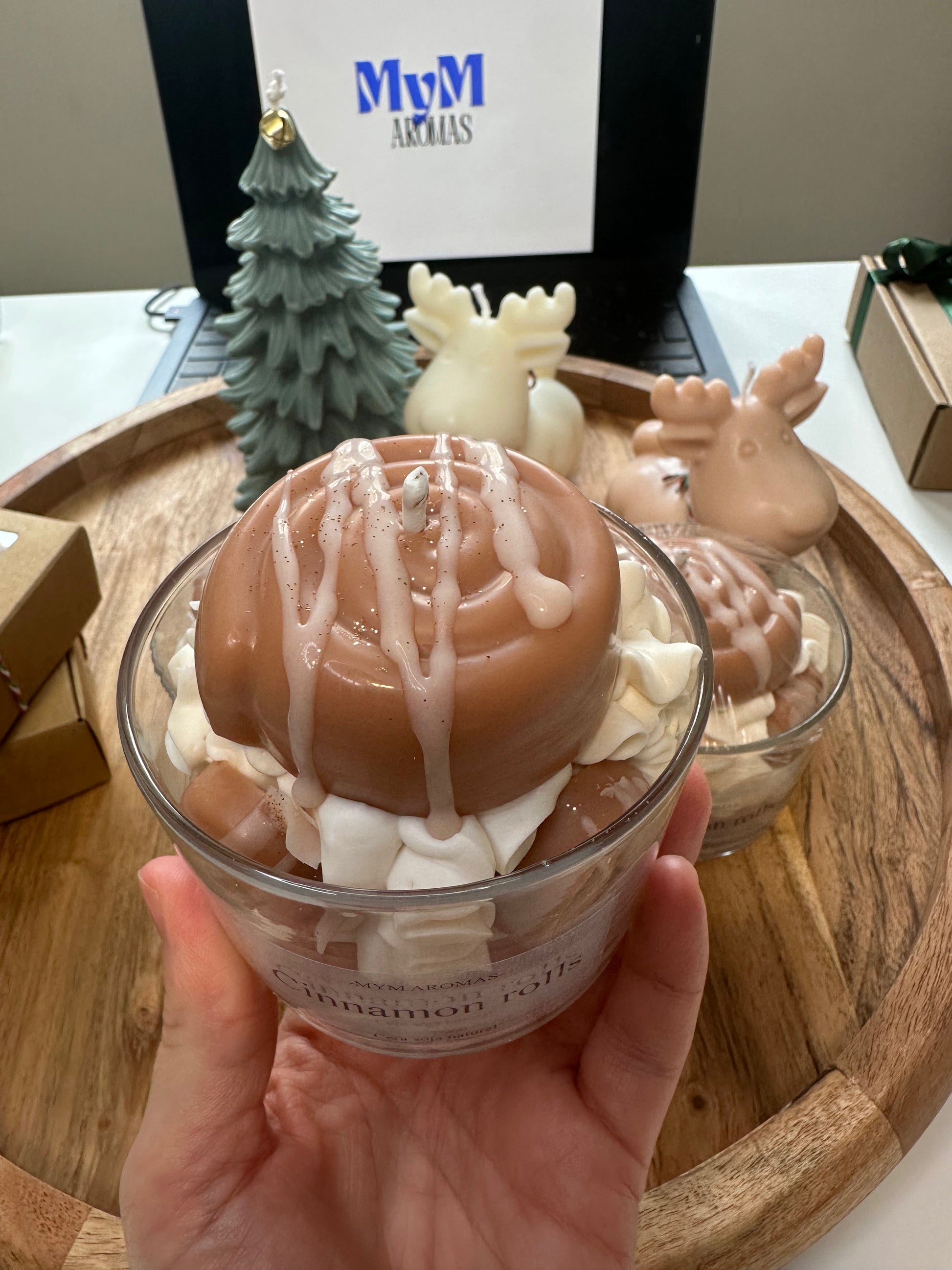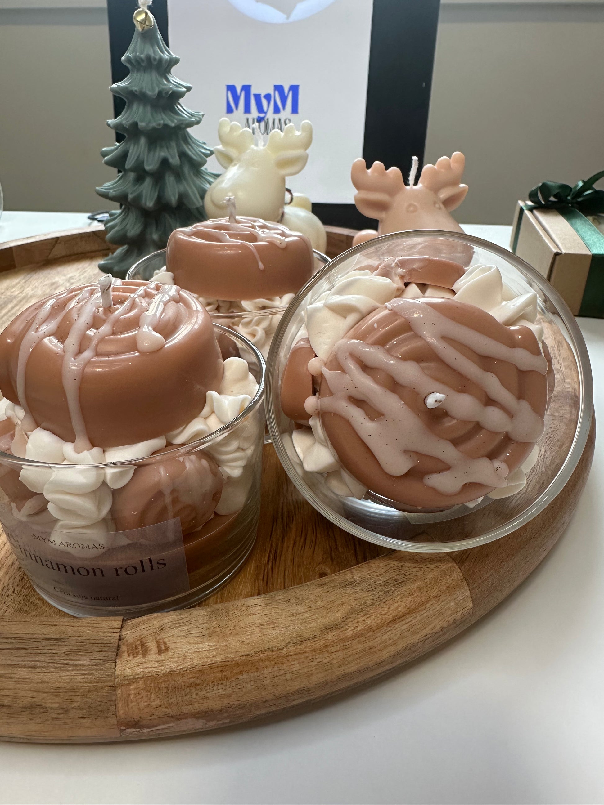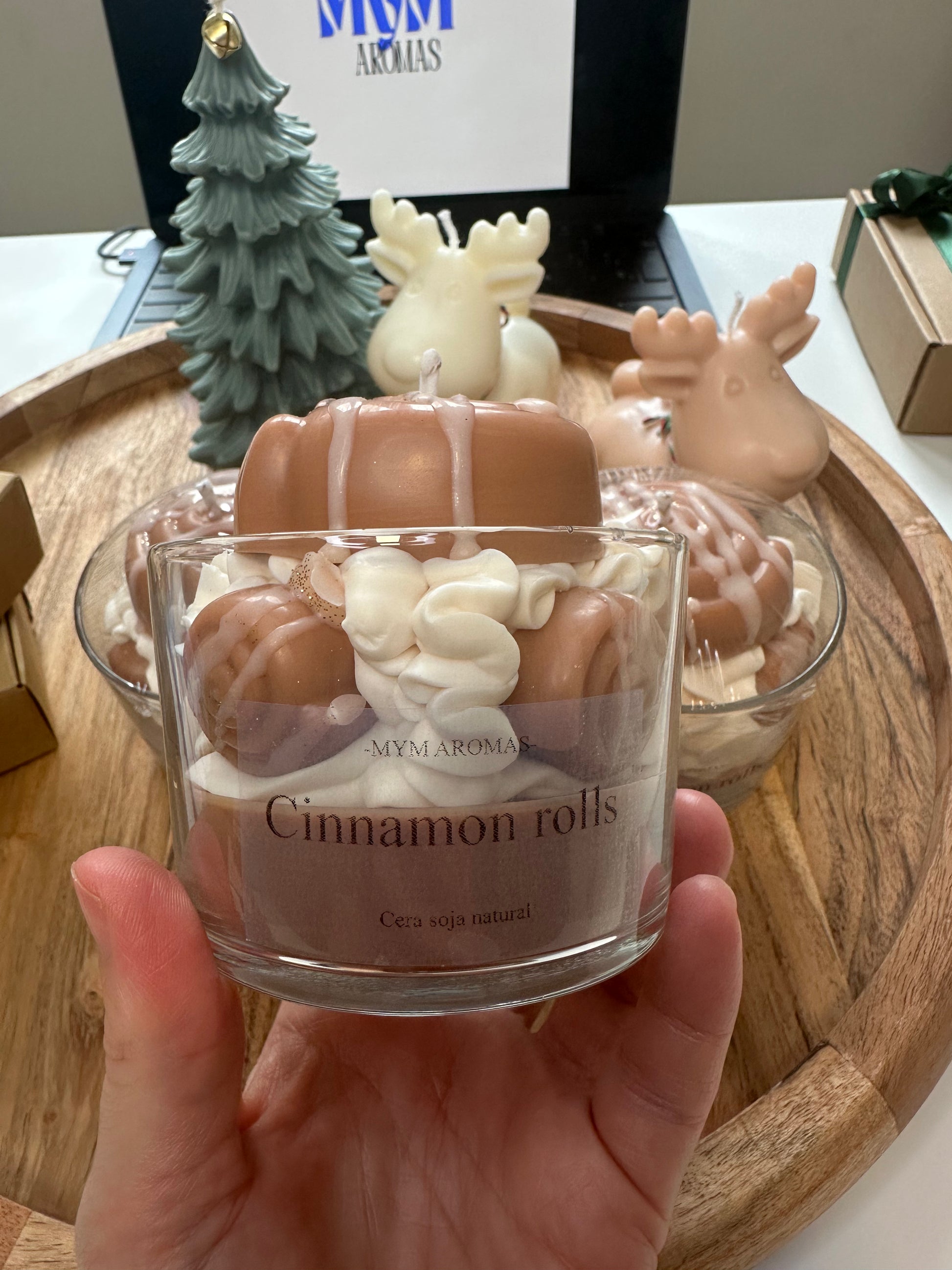vela cinnamon rolls, magnifica vela con forma a cinnamon rolls autentico recubierto de chantilly su aroma a mantequilla con notas de azúcar moreno caramelizado, pan brioche horneado y canela te hará recordar al propio cinnamon recién horneado
