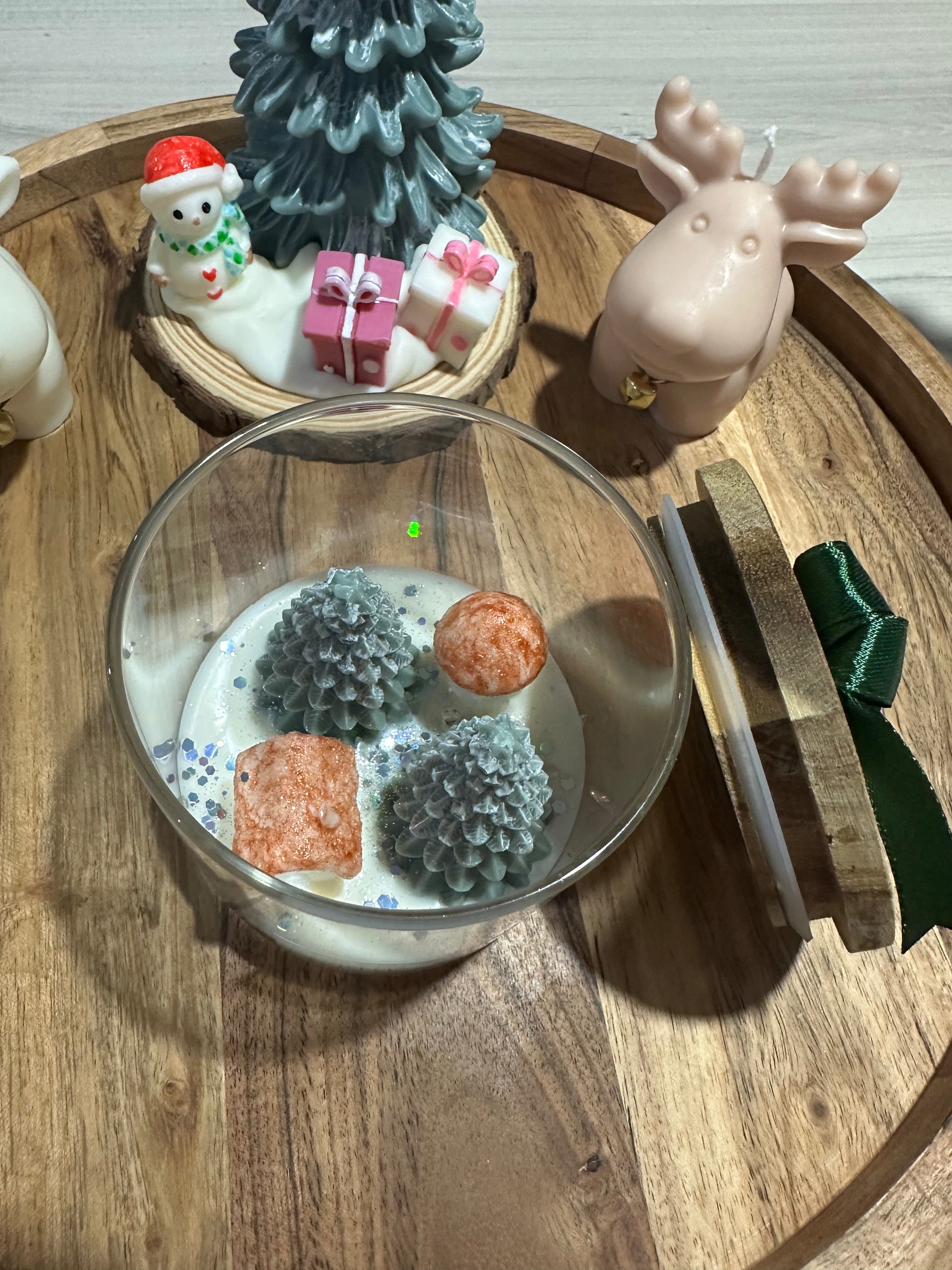 vela feliz navidad, pensada para decorar tu rincón estas navidades, con un pequeñito bosque con sus dos casitas muy hogareño, su aroma a pino queda perfecto con su olor a bosque y sus toques cítricos