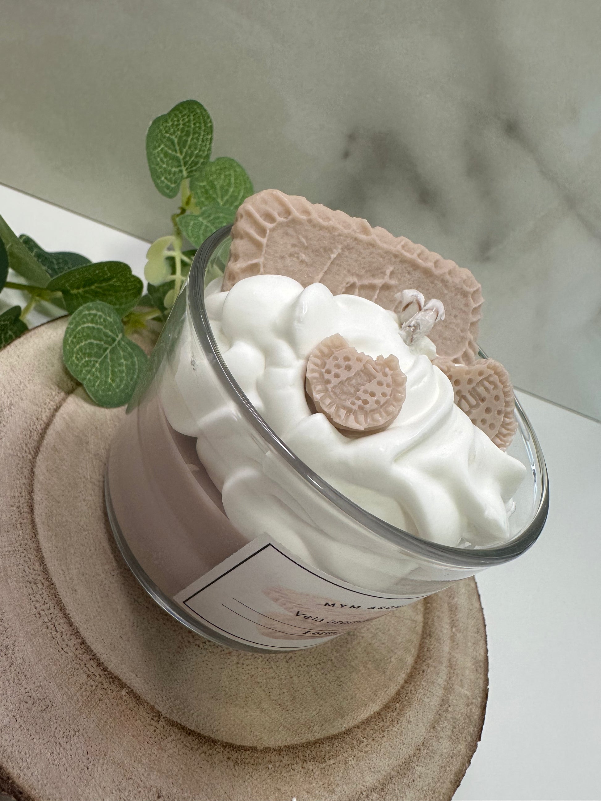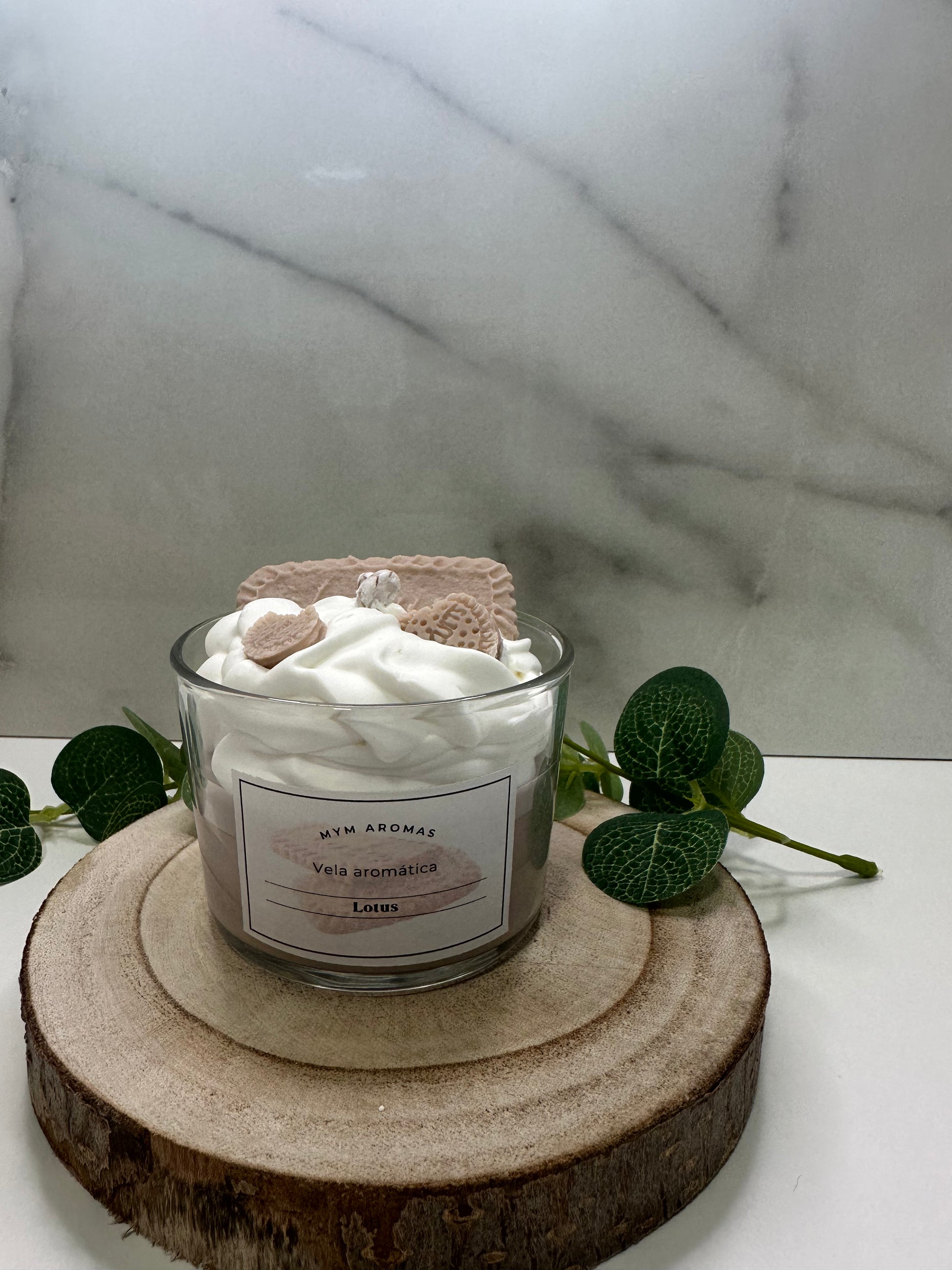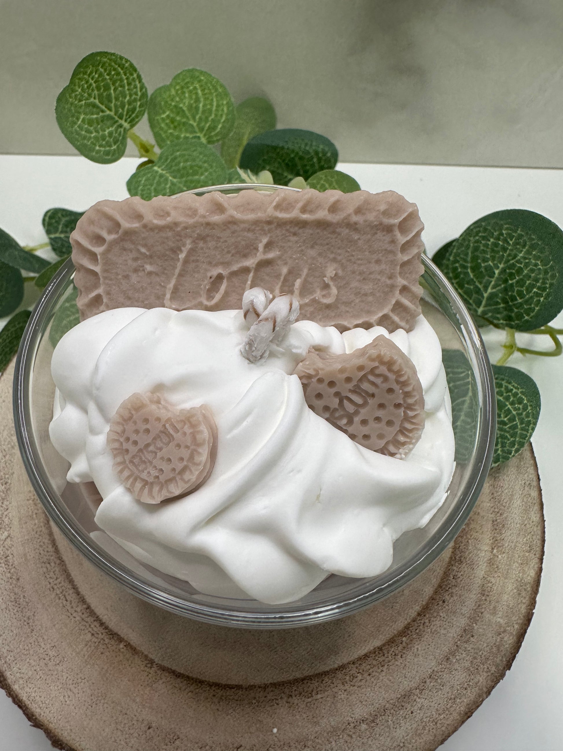 LOTUS, con base color marrón clarito con chantilly y encima galletas pequeñitas y la de Lotus, con aroma a biscuit, un aroma dulce con notas a caramelo, igual que la propia galleta Lotus