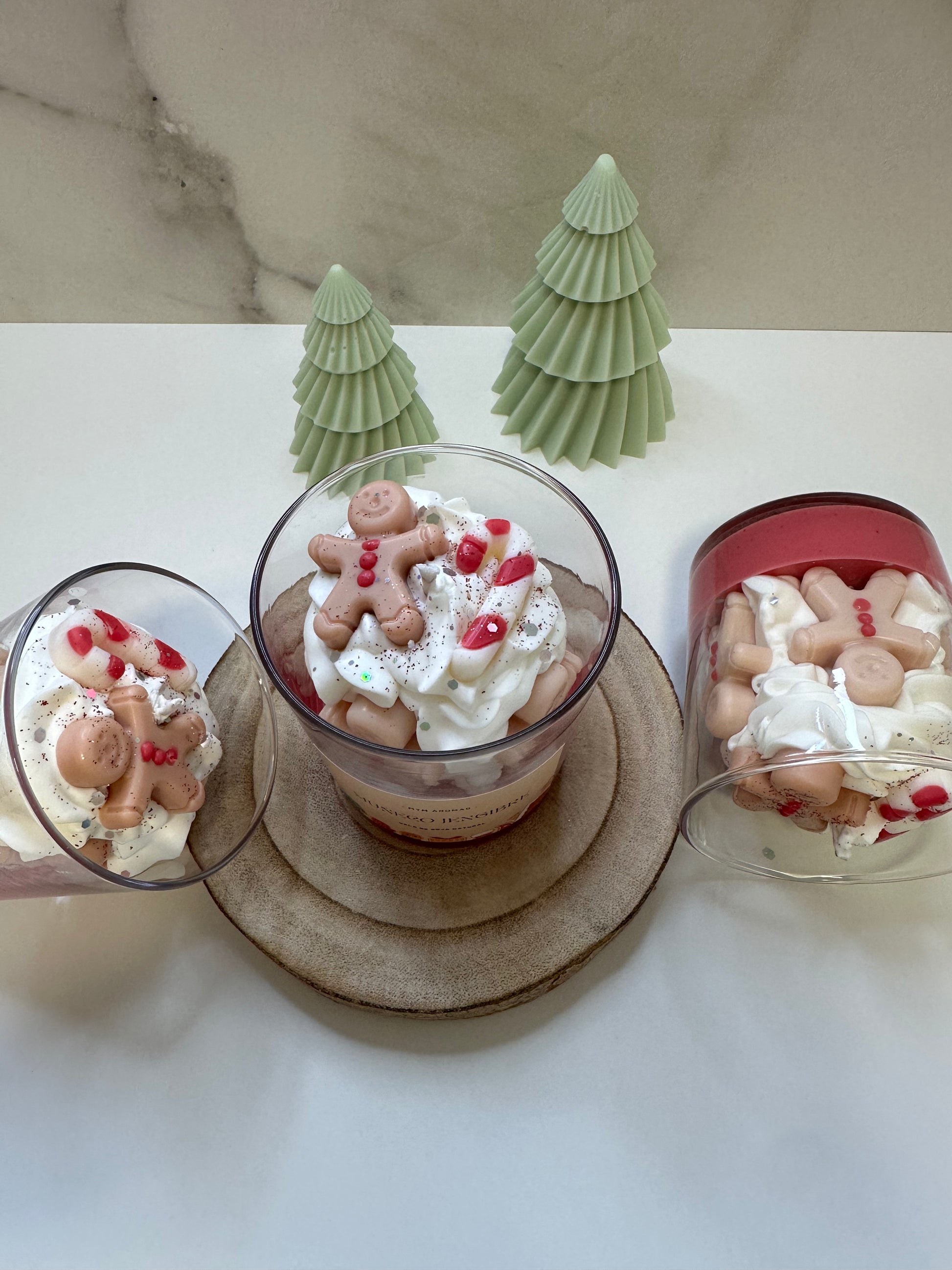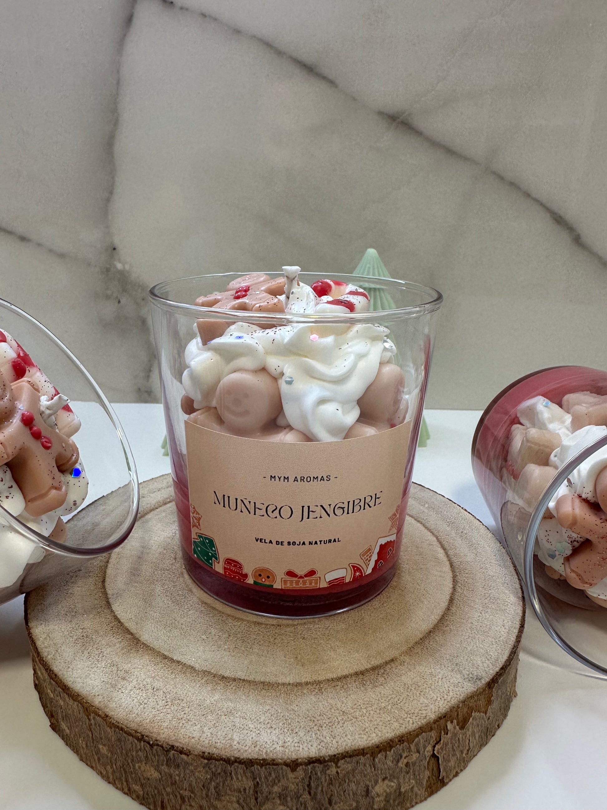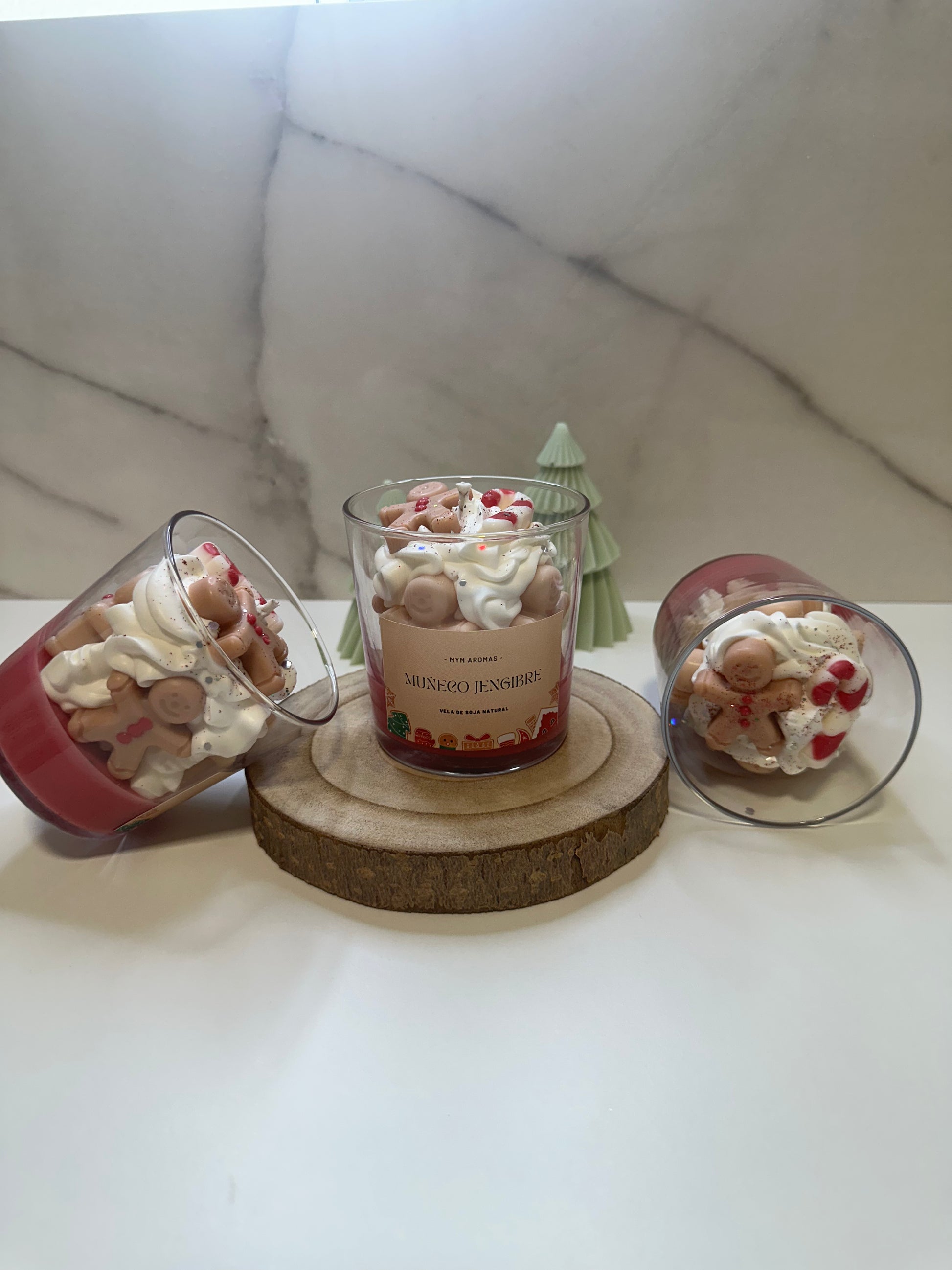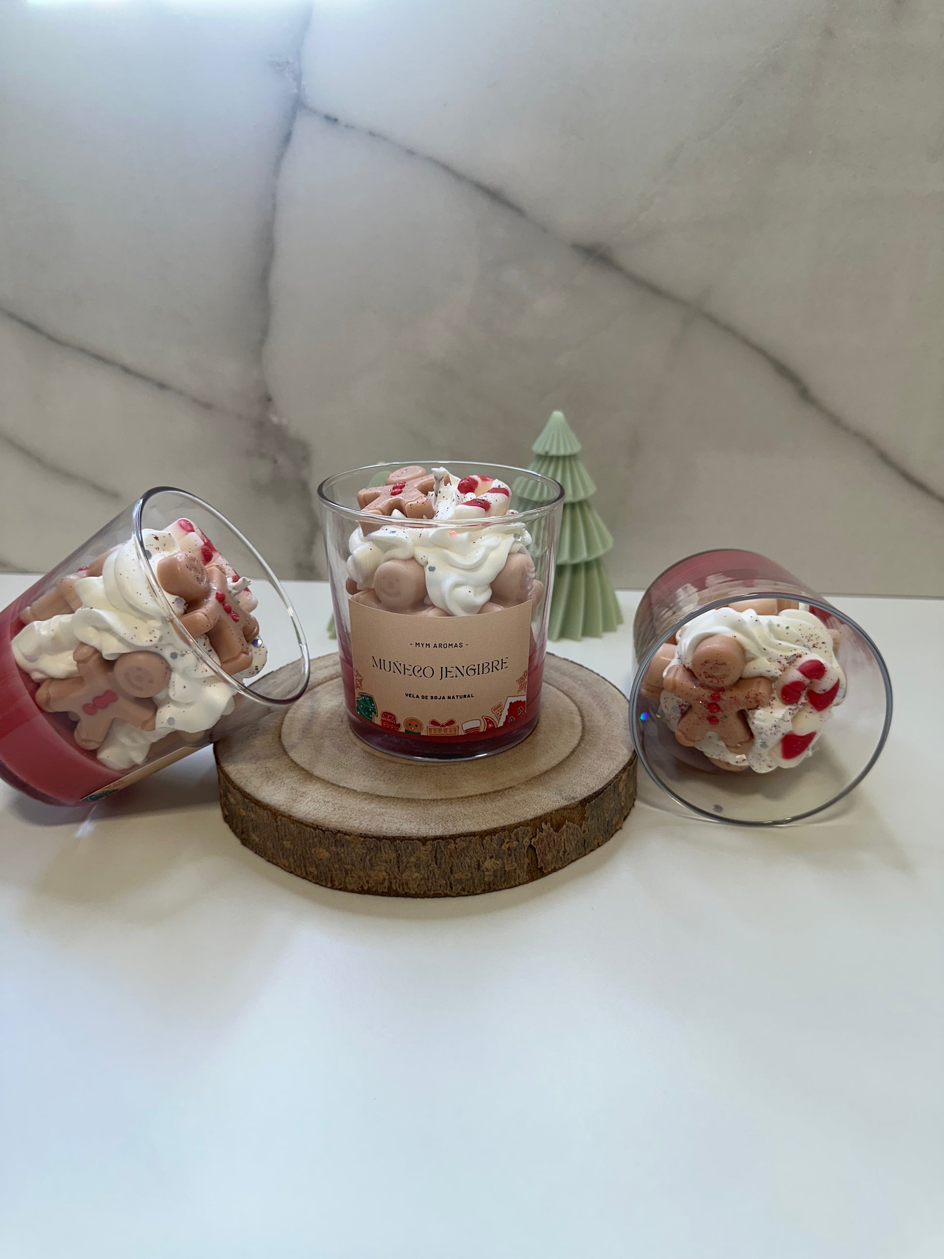 Muñeco de jengibre, vela con muñecos de jengibre un baston de navidad y chantilly, con aroma galleta de jengibre, olor cálido y especiado con matices dulces y aromáticos. recuerda a galletas recién horneadas, con notas de jengibre, canela, nuez moscada y clavo, creando un aroma reconfortante y nostálgico