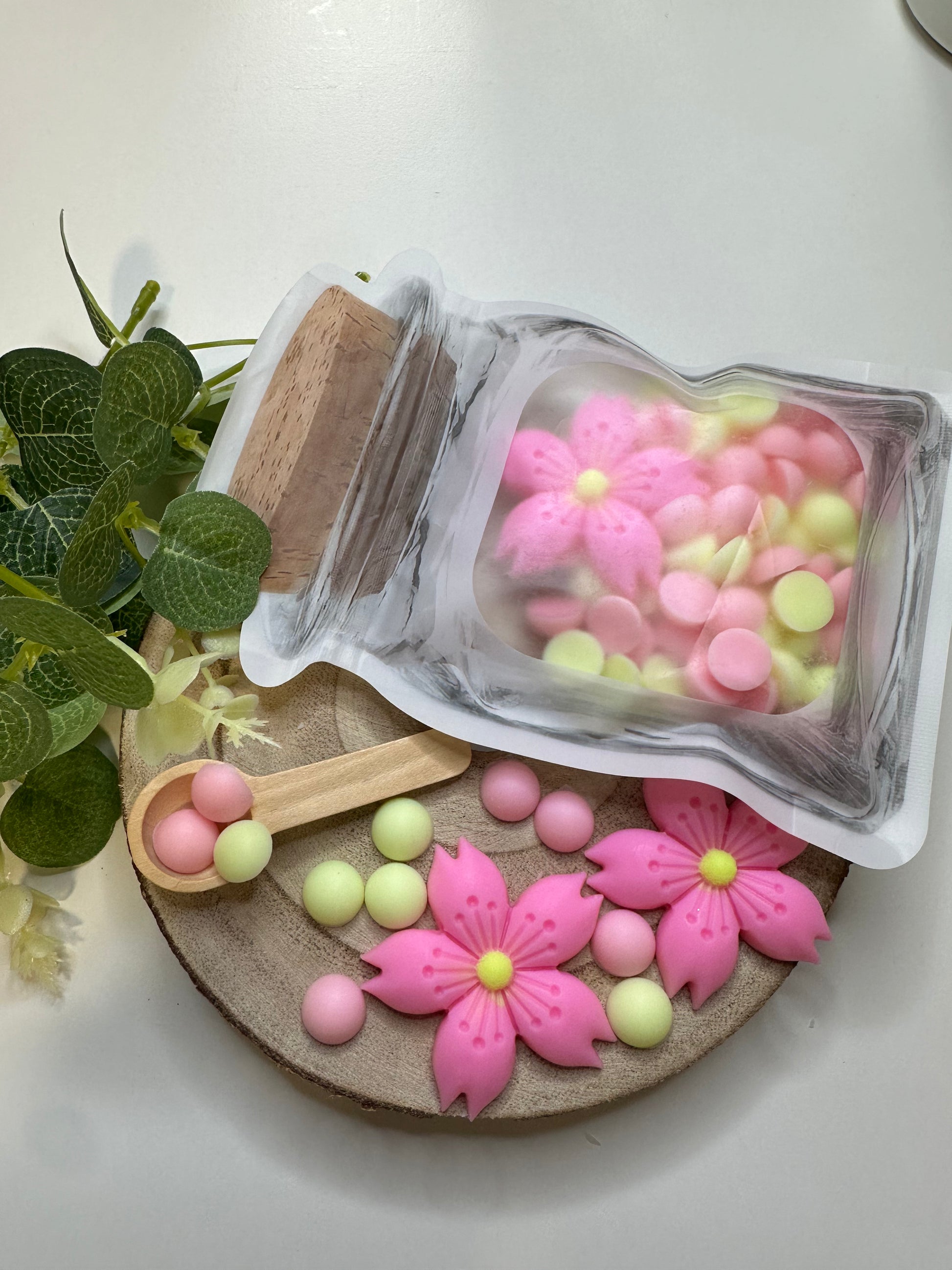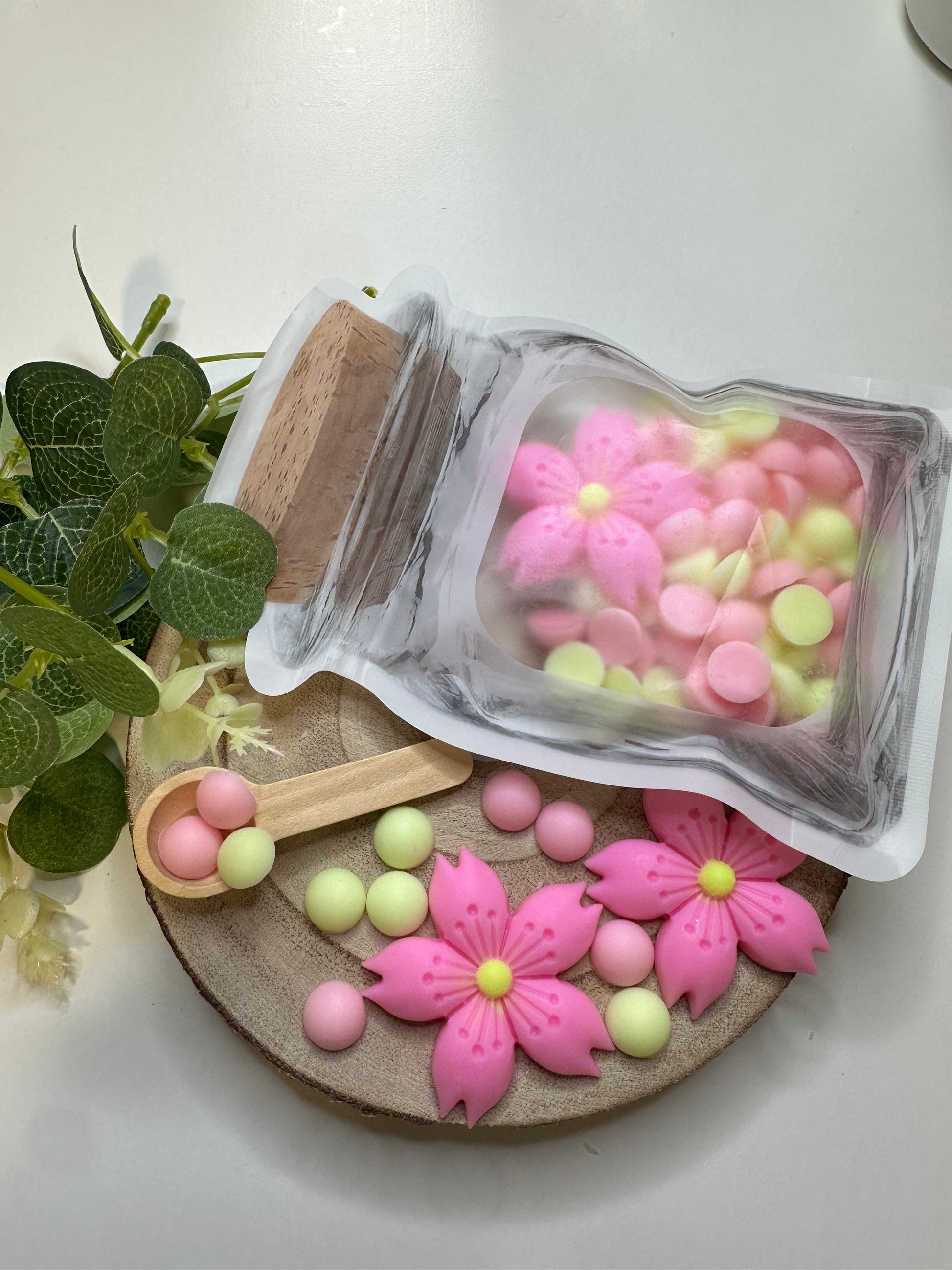FLORAL, con formas de flores y perlas en rosa y amarillo, con aroma floral, olor dulce y floral y a la vez intensa